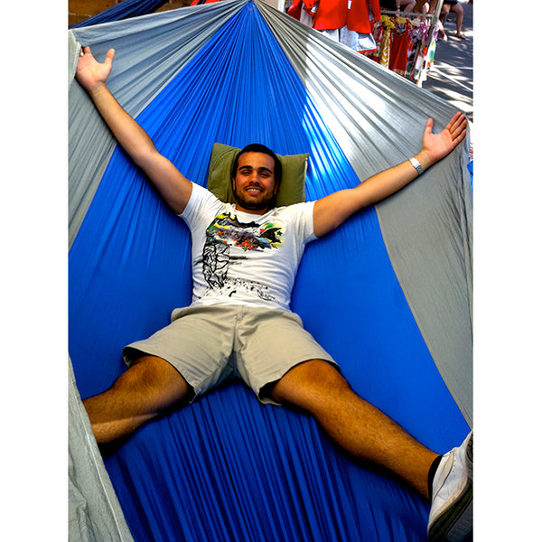 Hammock Bliss Triple is the largest, most spacious portable hammock on planet earth. Triple Bliss is ideal for couples who want to be extra friendly in a hammock. The huge surface area means that you can frolic in most any position and any direction with plenty of room to spare. Families love the expansive area as it provides a fun place to hang out with the kids that may result from all of that friendly snuggling. Great for tall people who want a hammock wide enough to lay in any direction. When size matters, Triple Bliss is the answer.