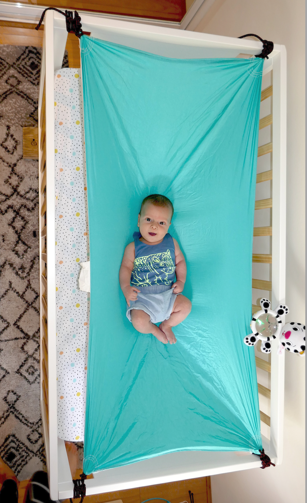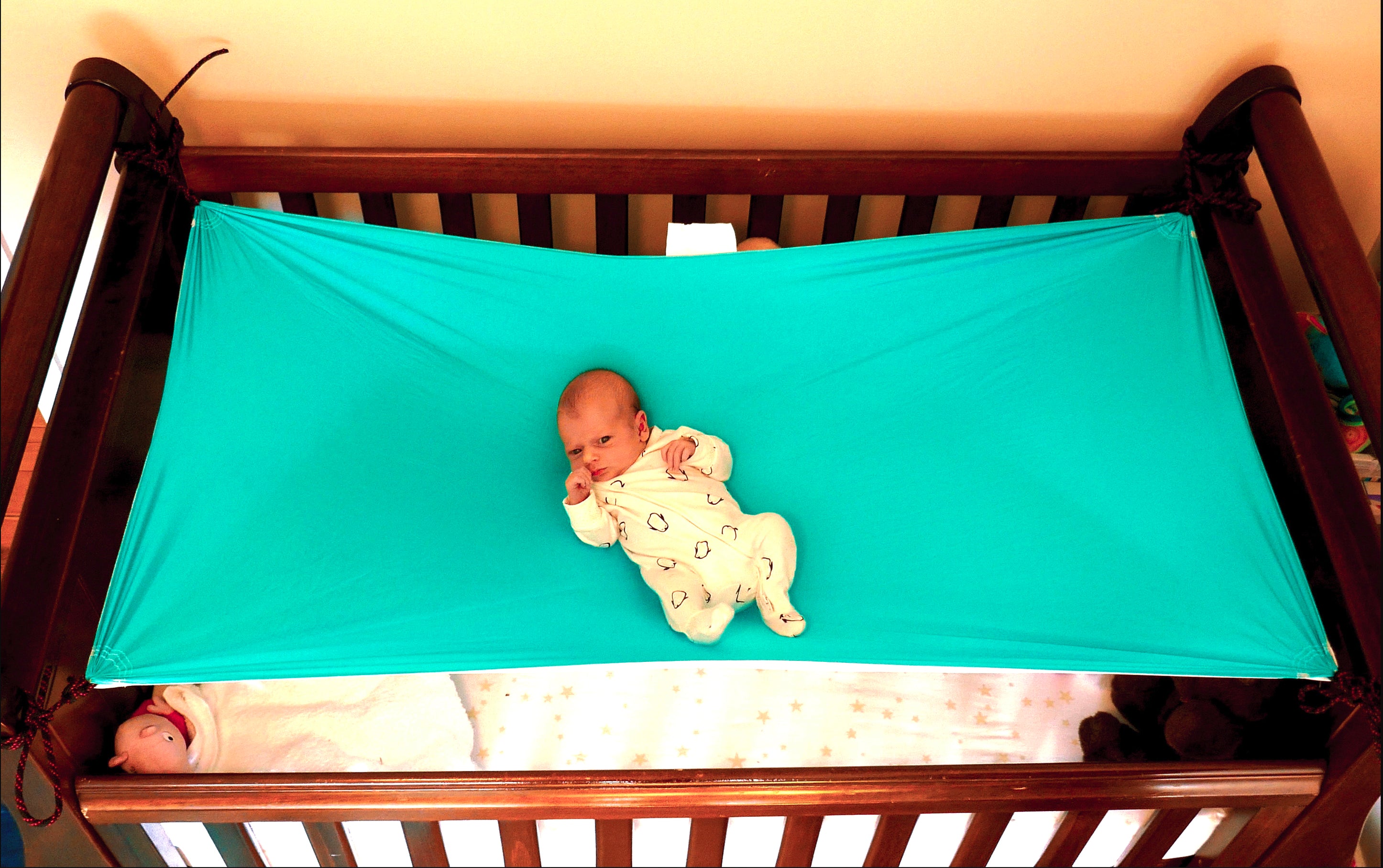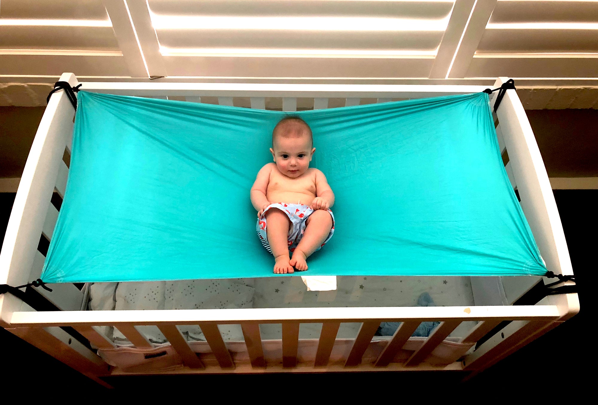 Hammock Bliss Sky Baby 2 creates a all new way for putting your baby to sleep by creating a flat hanging platform inside a crib.  Being on a sleeping platform mimics the only experience babies have ever known - being in their mother's womb. Laying in their Sky Baby 2 your infant will feel safe and secure.  The flat sleeping platform created by Sky Baby 2 helps baby to sleep which will make mommy and daddy happy as well. The Sky Baby 2 sleeping platform is the perfect size to hang inside a crib or travel cot.  Using the ropes provided on the four corners of the platform, the Sky Baby 2 can be securely attached to a crib or cot so your baby is relaxing just above its normal sleeping space.